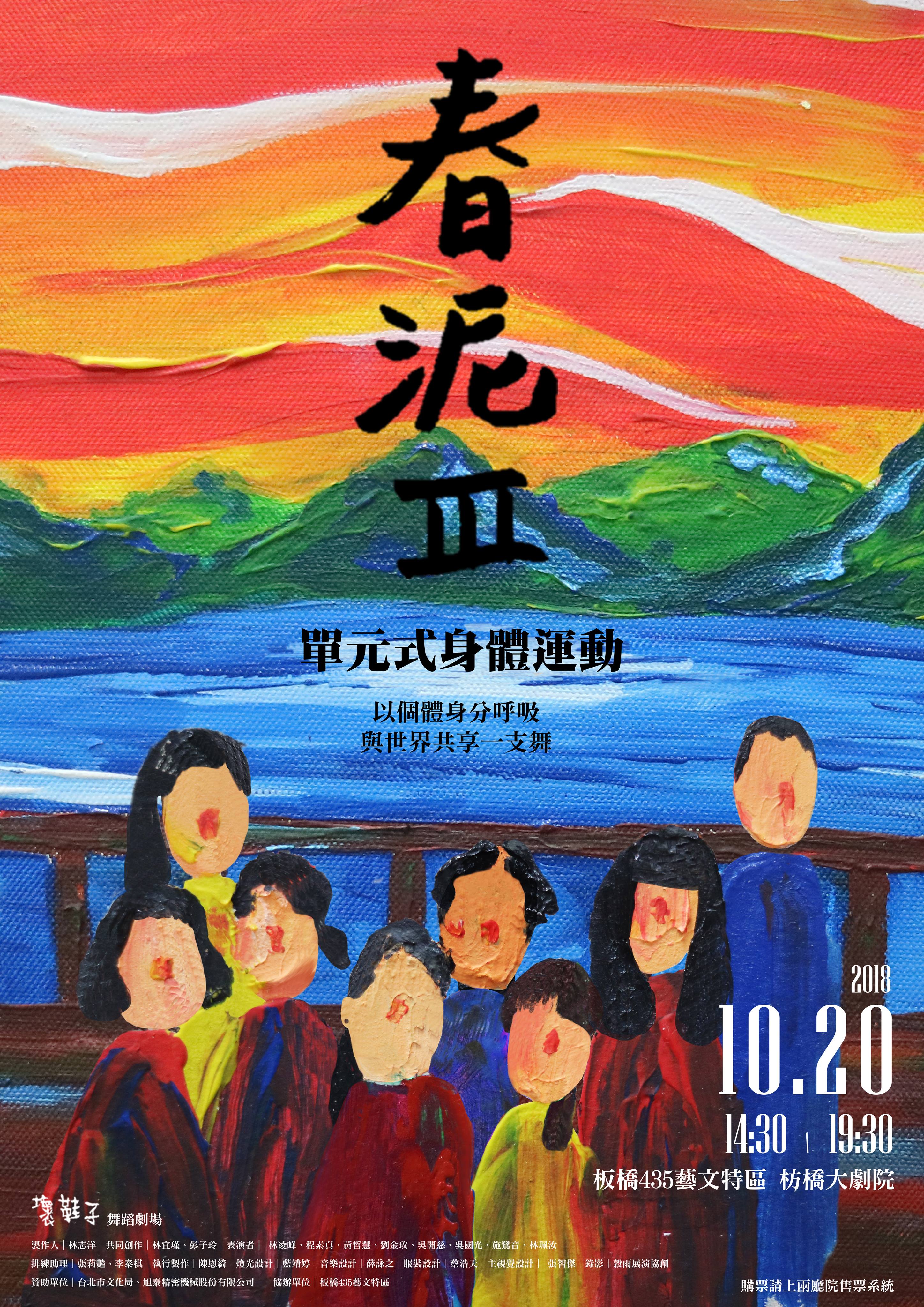 「春泥III─單元式身體運動」將於107年10月20日下午2點30分及晚間7點30分,於板橋435藝文特區精彩發生,對於即將自園區畢業的壞鞋子舞蹈劇場來說,這是最浪漫的告別方式,宜瑾所說:「用時間,用人情的關係在『交陪』!」歡迎喜歡跳舞的大小朋友,一同走上壞鞋子跳出的春泥路,感受「人人皆能跳舞」的美好體驗。